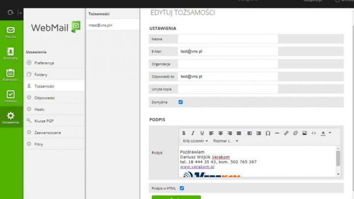 - W polu podpis możesz podać swoje dane lub informacje, które zostaną dodane w stopce każdej wiadomości którą wysyłasz. Do dyspozycji domyślnie włączony jest zwykły edytor, wybranie opcji Podpis w HTML pozwala na użycie dodatkowych funkcji formatowania tekstu.